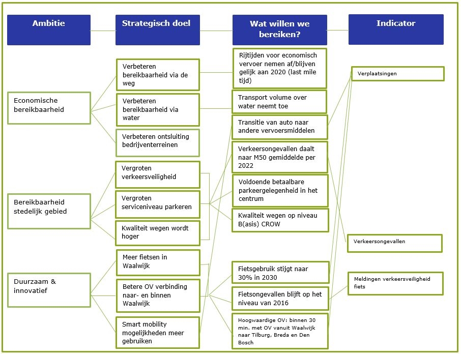 Bereikbaarheid, overal makkelijk kunnen komen, is één van de urgenties & potenties van Waalwijk uit onze strategische visie. Uit de digitale enquêtes en de gesprekken met inwoners en ondernemers kwam de goede bereikbaarheid van Waalwijk steeds terug als pluspunt. Bereikbaarheid draagt bij aan onze economische ambities, aan de aantrekkelijkheid om hier te wonen.