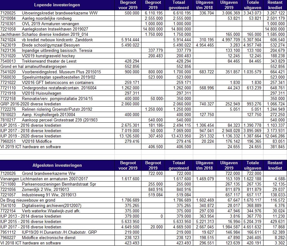 Overzicht belangrijkste lopende investeringen