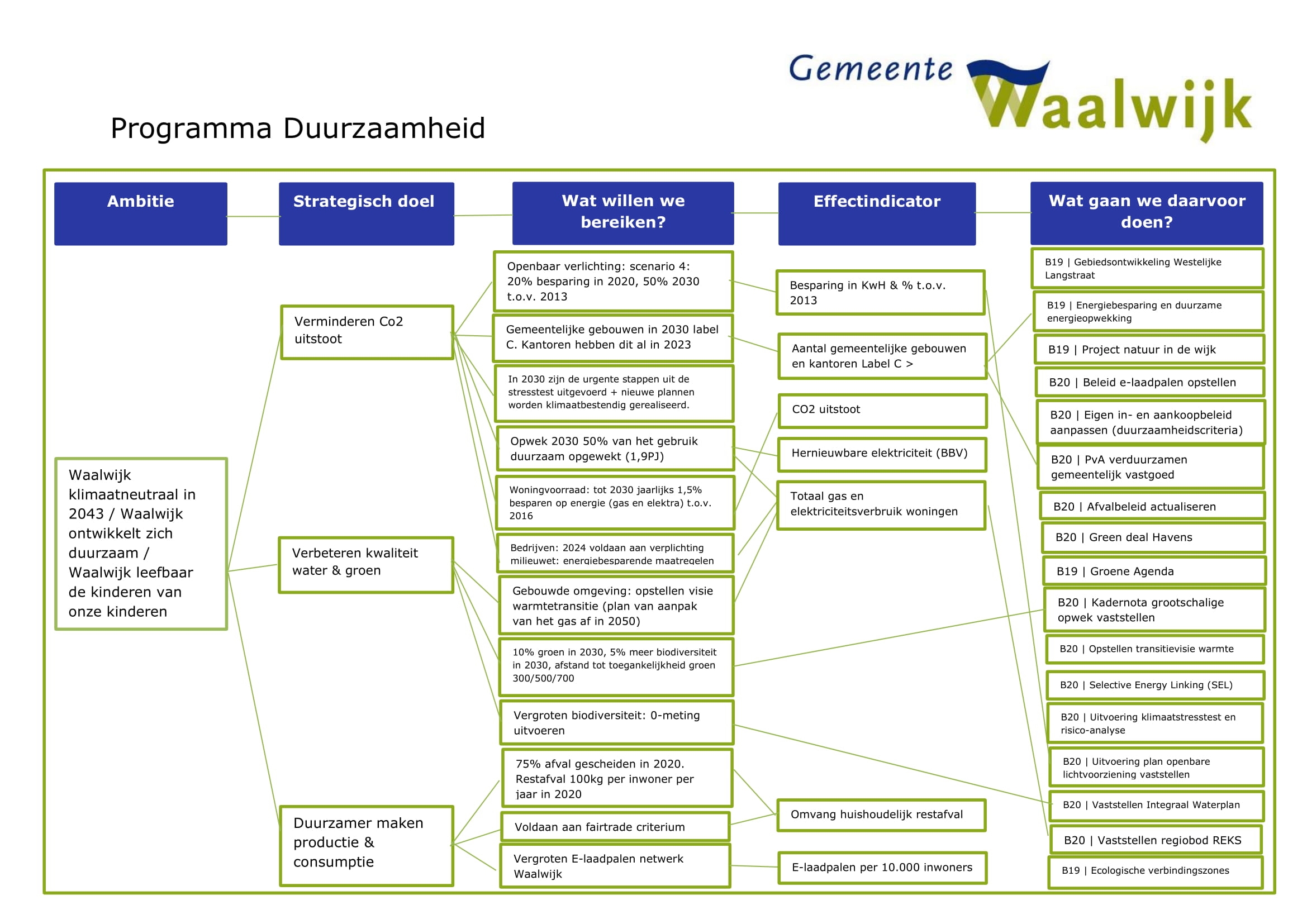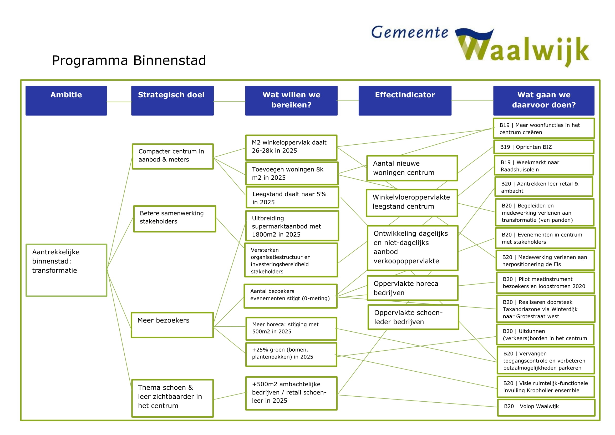 In onze strategische visie Waalwijk 2025 hebben we de binnenstad benoemd als één van de urgenties. We gaan de binnenstad transformeren tot een toegankelijke en aantrekkelijke plek voor ontmoeting en vermaak. Daarbij verbinden we onze schoen- en lederbedrijven aan de retail- en leisurefunctie. Tegelijkertijd gaan we naar een compacter centrum dat minder leunt op winkels, maar waar ruimte is voor ontmoeten en wonen.