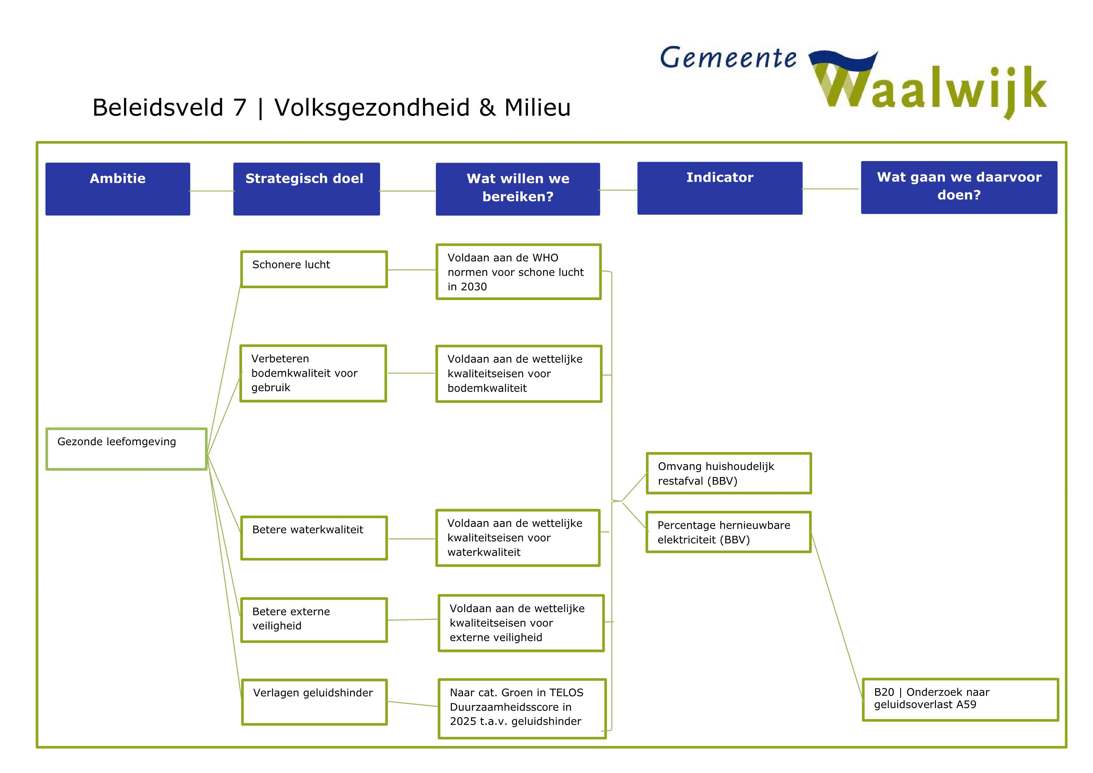 De gemeente Waalwijk heeft zich aangesloten bij het landelijk Schone Lucht Akkoord. Dit betekent dat in de gemeente Waalwijk in 2030 overal voldaan moet worden aan de World Health Organization (WHO) normen. Hiervoor wordt een gemeentelijk uitvoeringsprogramma vastgesteld. Het RIVM is bezig met het opstellen van indicatoren. Deze verwachten wij in 2021.