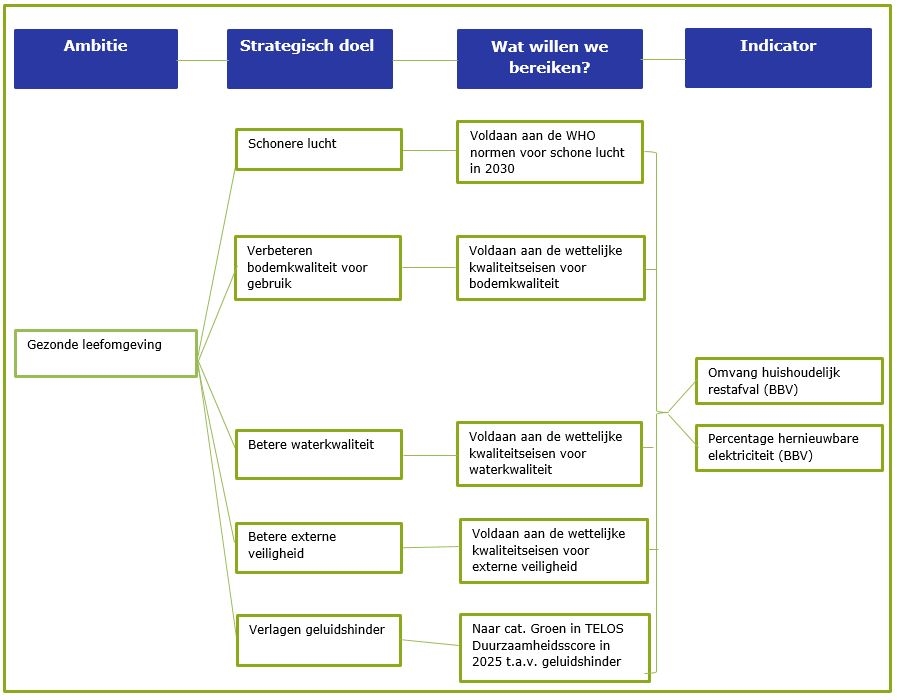 Op het gebied van milieu werken we aan de kwaliteit van de bodem, lucht, geur, licht en de externe veiligheid. Bij een gezonde leefomgeving denken we aan een aantal aspecten. Het gaat om schone lucht, bodem geschikt voor het gebruik, externe veiligheid en geluid. Voor deze aspecten voldoen we aan de huidige wettelijke normen. De wetgeving van lucht, bodem, water, externe veiligheid en geluid wordt opgenomen in de nieuwe Omgevingswet. De komende jaren bereiden we ons voor op deze integratie. Het kan zijn dat normen en indicatoren tijdens de integratie veranderen.
