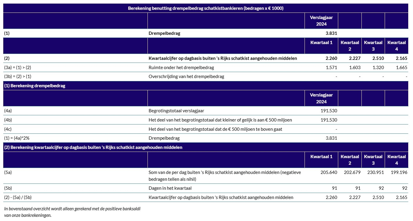De kasgeldlimiet is het maximum aan gemiddelde netto vlottende schuld dat een gemeente in een kwartaal mag hebben. Bij netto vlottende schuld gaat het om financieringen met een looptijd korter dan 1 jaar. De minister heeft de kasgeldlimiet op 8,5% van het begrotingstotaal vastgesteld. Voor Waalwijk was dat in 2024 afgerond € 16,3 miljoen. In 2024 is de kasgeldlimiet niet overschreden: