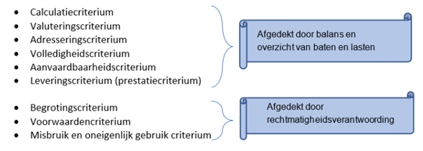 In de jaarrekening legt het college verantwoording af over negen criteria van rechtmatigheid. De eerste zes criteria, die betrekking hebben op getrouwheid en óók onderdeel zijn van rechtmatigheid, komen tot uitdrukking in de balans en het overzicht van baten en lasten. De drie specifieke rechtmatigheidscriteria komen tot uitdrukking in de rechtmatigheidsverantwoording en betreffen het voorwaardencriterium, het begrotingscriterium en het misbruik en oneigenlijk gebruik criterium.