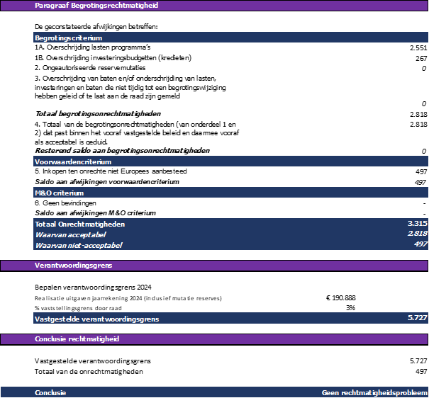 In de jaarrekening 2024, onderdeel Analyse begrotingsafwijkingen is een nadere toelichting opgenomen van de begrotingsafwijkingen. Hierbij is aangegeven dat de overschrijding op beleidsveld 0, 1, 4 en 5 niet onrechtmatig is gelet op eerdere besluitvorming hierover door de raad en anderzijds omdat de uitgaven geheel passen binnen het door de raad uitgezette beleid.